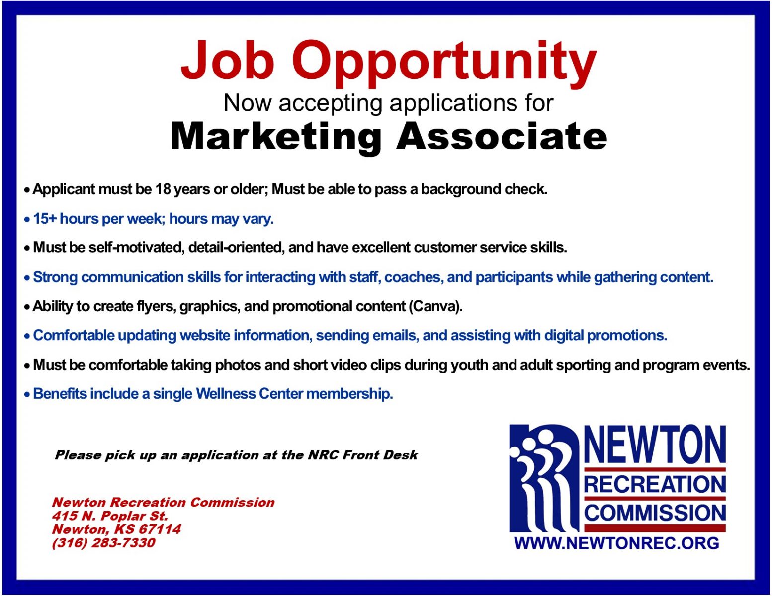 For an application please stop by the NRC front desk at 415 N Poplar.